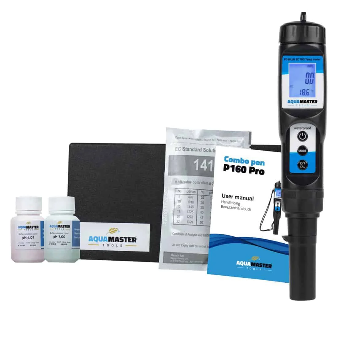 Aqua Master Tools Combo Pen P160 Pro er en kompakt enhed der måler pH, EC og temperatur i én håndholdt måler. Den giver dig fuld kontrol over de vigtigste parametre i din næringsstofopløsning uden at du skal skifte mellem flere instrumenter.