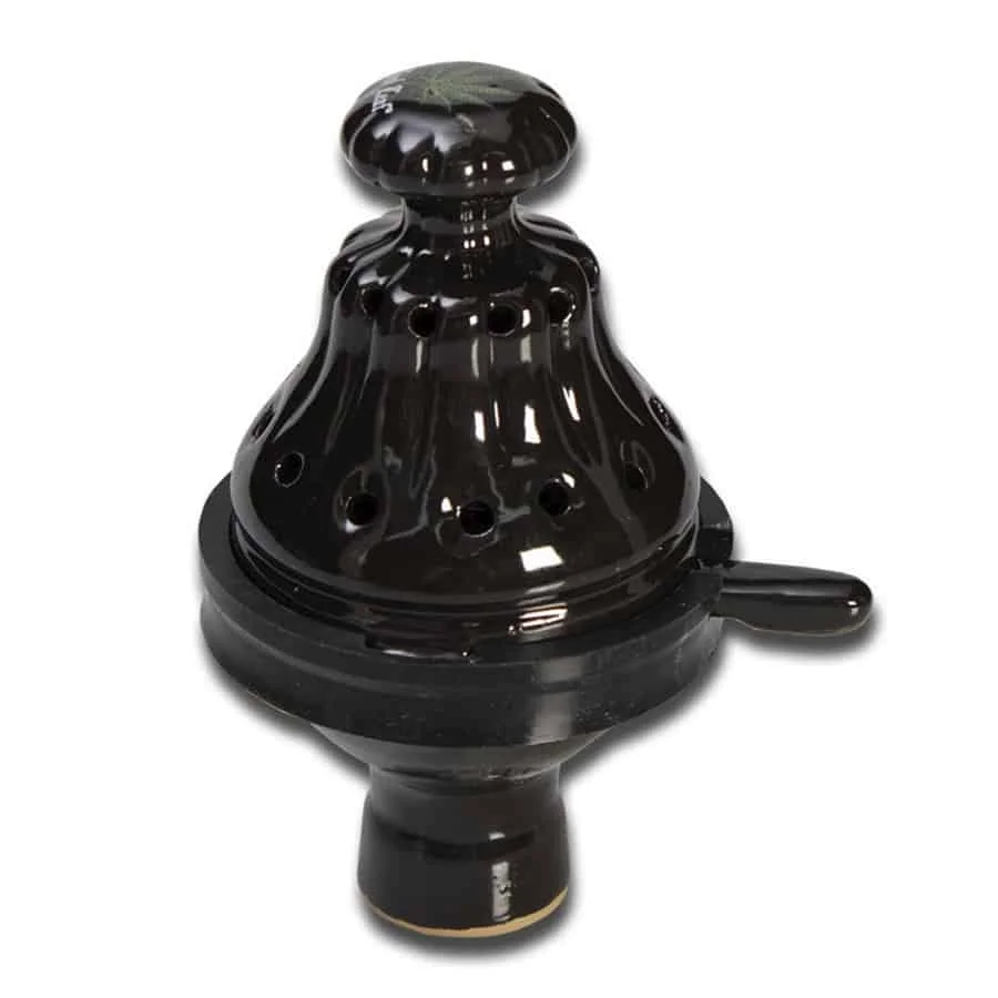 Black Leaf Shisha Top Bowl er et vandpibehoved med låg designet til brugere, der foretrækker et lukket design med bedre kontrol over varmen. Det lukkede system holder varmen inde og forlænger levetiden på kullene, hvilket resulterer i længere rygesessioner uden behov for hyppige kulskift.