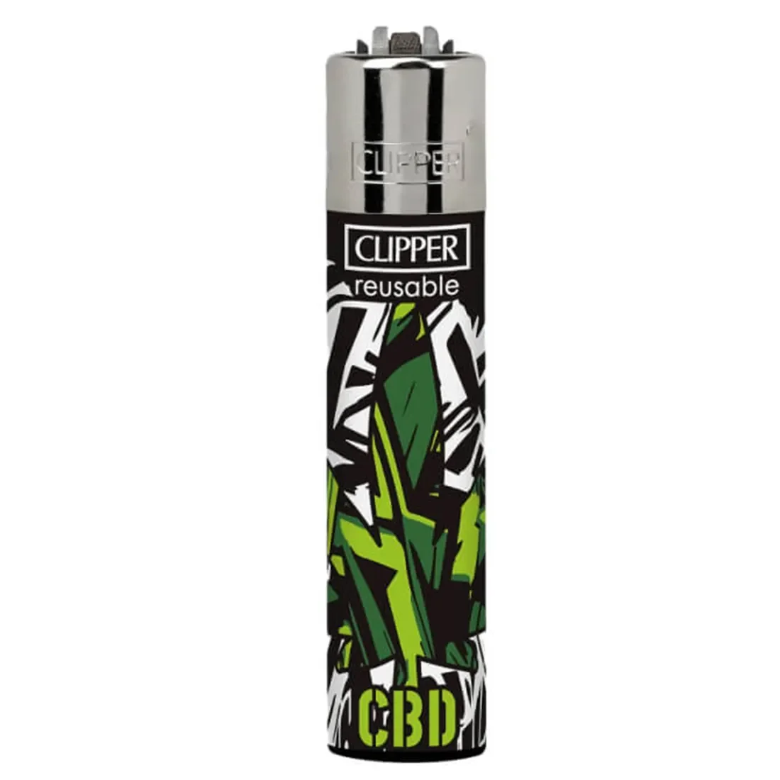 Lighter med CBD Sign Green-motiv fra Clipper. Designet viser grønne blade mellem hvide og sorte linjer i et grafisk streetart-look.