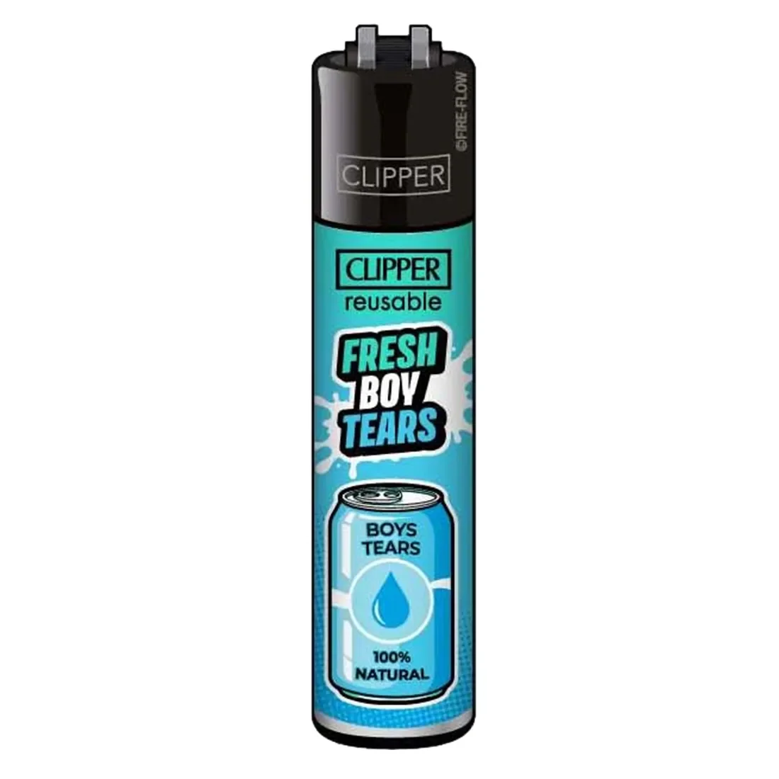 Lighter med et humoristisk Fresh Boy Tears-motiv fra Clipper. Designet viser en blå sodavandsdåse fyldt med Boys Tears, hvilket får smilet frem.