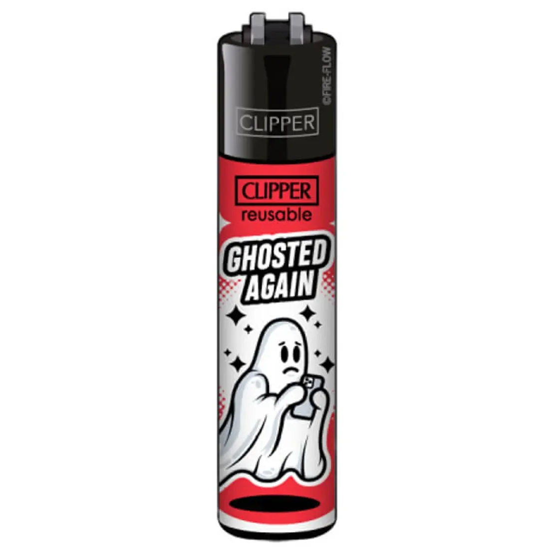 Lighter med Ghosted Again-motiv i rød fra Clipper. Designet viser et spøgelse der ser ud som om det netop er blevet ignoreret på sin telefon. Humoristisk og sjovt.