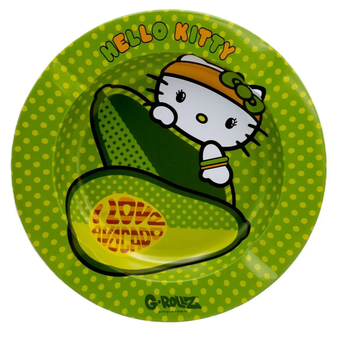 G-Rollz Hello Kitty Avocado Ashtray er et askebæger i letvægtsmetal med et farverigt design. Hello Kitty gemmer sig bag en skive af sin favoritfrugt avocado i dette charmerende og humoristiske motiv. Det er et askebæger med personlighed.