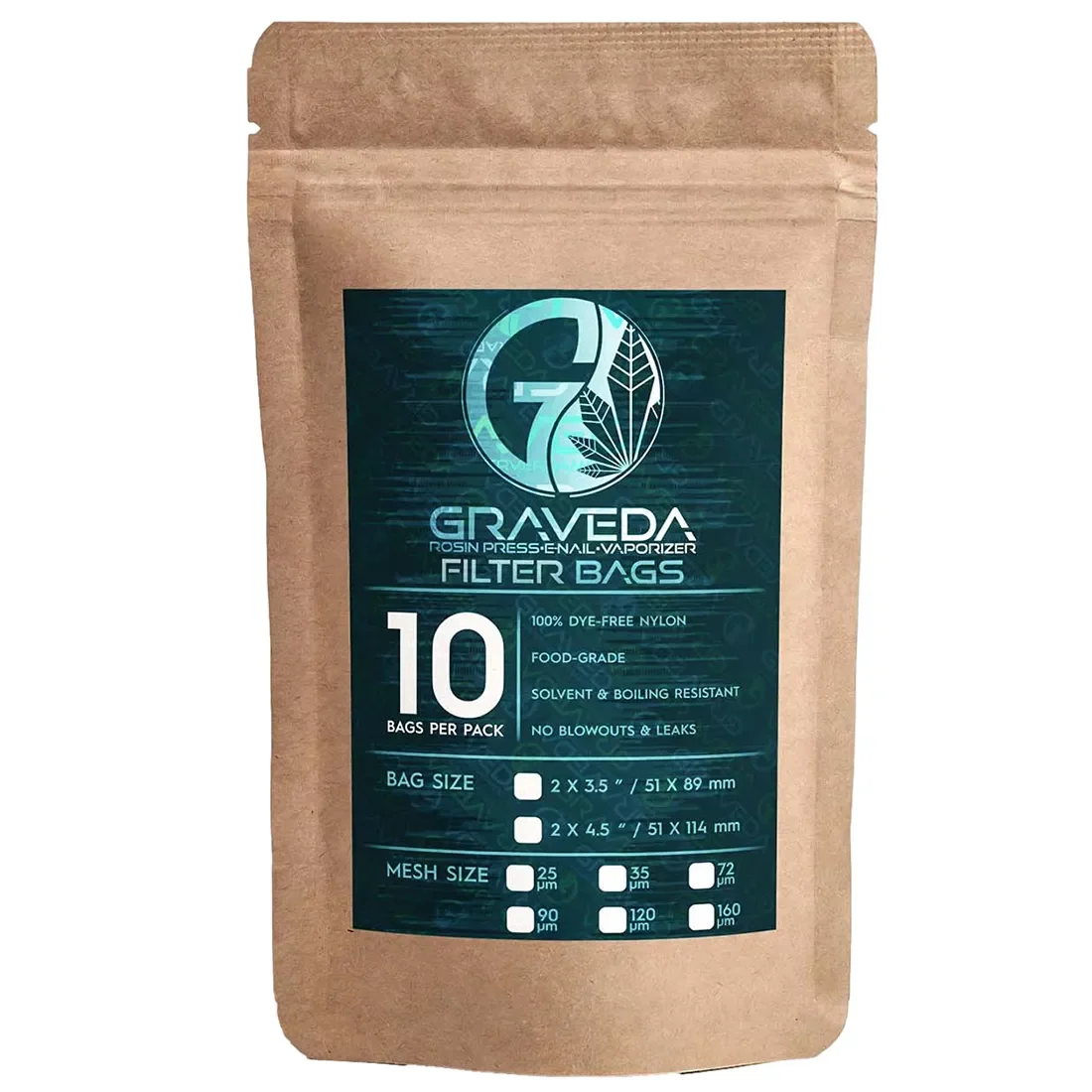 GRAVEDA Rosin Filter Bags med 72 µm maskebredde er fremstillet i størrelsen 70 x 160 mm og passer til større rosin-pressere. Poserne er lavet af 100% farvefrit, fødevaregodkendt nylon der sikrer at ingen urenheder tilføres under presningen.