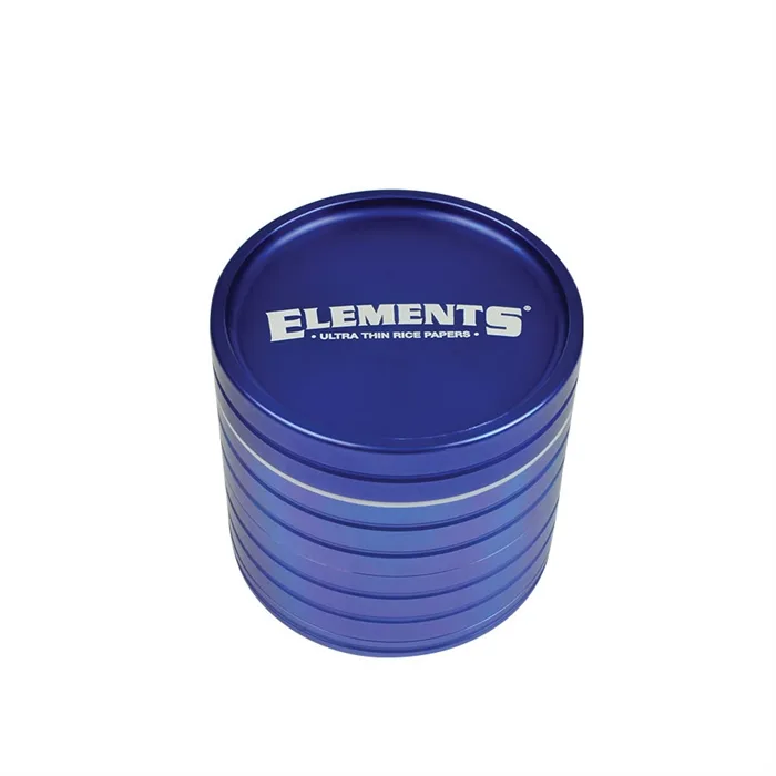 4 delt grinder fra Elements, lavet i høj kvalitets aluminium med en flot himmel blå finish, samt påtrykt Elements logo. Unikt "tray top" design, med rillet yderkanter for et bedre greb, pollen skraber til opsamler bunden medfølger Diameter: 56 mm Størrelse: Medium Grinderen kan fås i 2 forskellige størrelser på 50 eller 56 mm i diameter