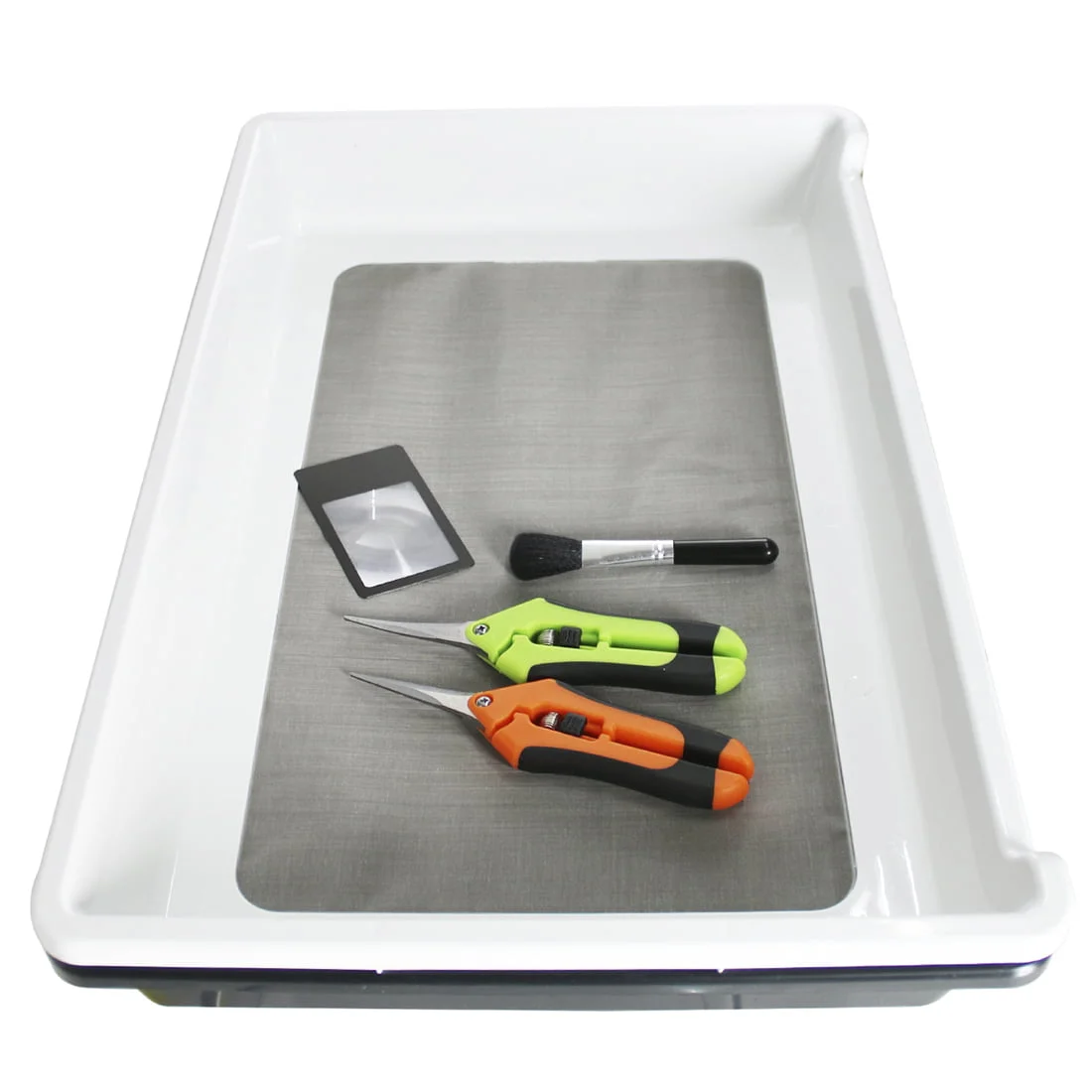 Trimmebakken består af to lag, der nemt kan adskilles for tømning og rengøring. Det øverste lag har en finmasket skærm i rustfrit stål med 150 my maskestørrelse, som opsamler småblade og pollen i det nederste lag under trimningen. Bakken måler 500 x 325 x 90 mm og giver god arbejdsplads.