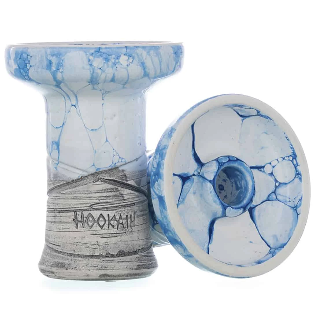 Den sky blue glasur med hvide nuancer er brændt fast i leret ved høj temperatur og giver et karakteristisk udseende, der skiller sig ud fra standard keramikhovedet. Glasuren er slidstærk og bevarer sin farve over tid. Hovedet måler 100 mm i højden og 80 mm i bredden og passer til de fleste vandpiber med standard gummiadapter.