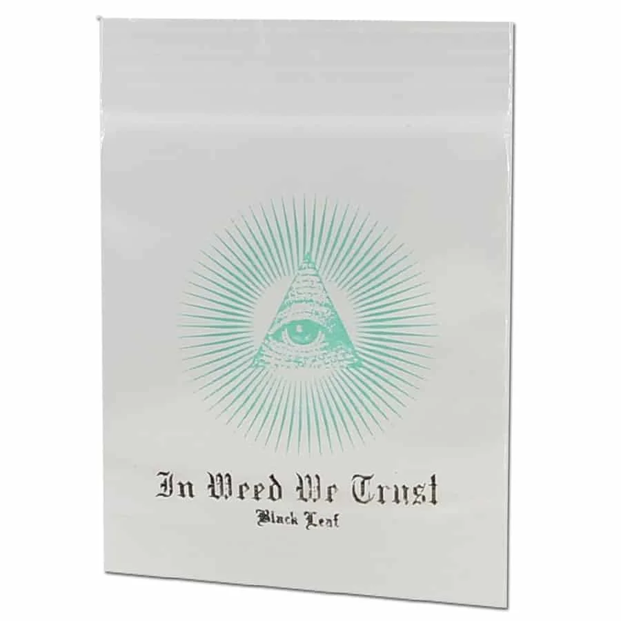 Disse lynlåsposer fra Black Leaf har et ikonisk "In Weed We Trust" illuminati-design. De er fremstillet af gennemsigtig fødevaregodkendt plastik.