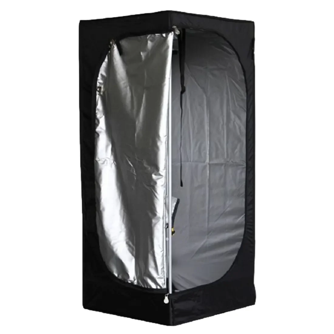 Metalrammen samles uden værktøj og giver stabilitet til ophæng af lamper. Stoffet er slidstærkt og tåler de fugtige forhold i et aktivt dyrkningsrum. Ventilationsåbninger tillader luftcirkulation og tilslutning af lille udsugning.