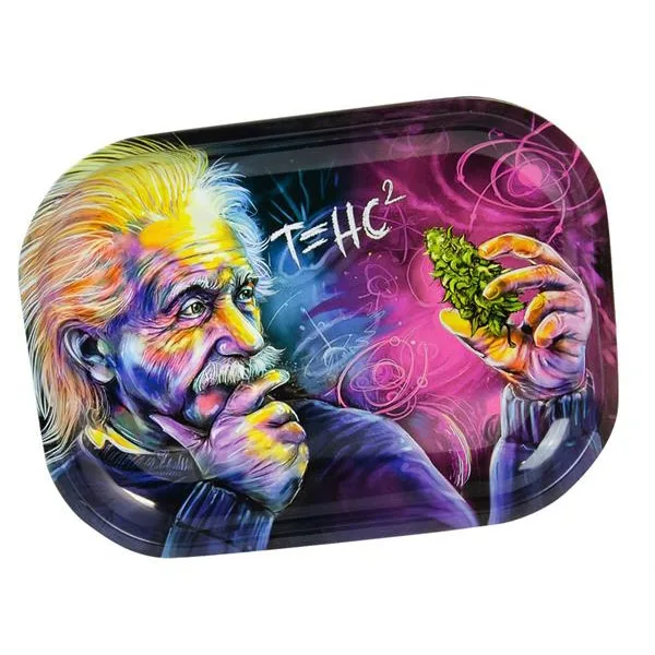 Metal bakke til at rulle på, måler 18 x 14 x 1 cm Motiv : Einstein der spekulerer over THC