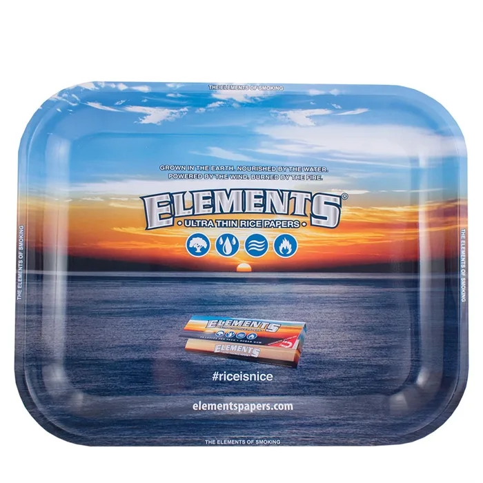Mixerbakker i stor metal, lille størrelse med ELEMENTS logoet, perfekt kombineret med deres kvalites jointpapir, filtertips, eller cones.