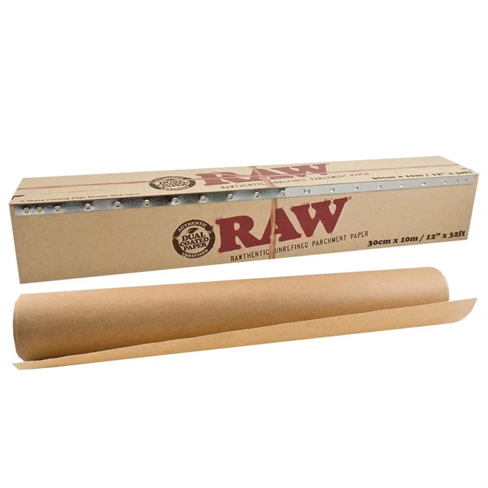 RAW Pergament er et naturligt, uraffineret og ubleget produkt, der har et ekstra glat dobbelt, naturligt, og miljøvenligt silikoneovertræk. Dette pergament er absolut den bedste løsning til voks, rosin, nol eller andre "sticky" ting. Det er helt sikkert at bruge med skrabeværktøjer.