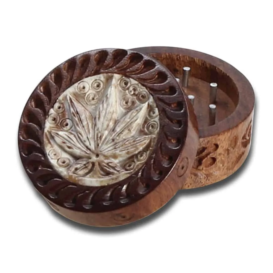 Naturlig æstetik med denne lille grinder i palisandertræ. Det håndskårne bladmønster på låget giver hvert eksemplar sit eget karakteristiske udseende med naturlige variationer i træets årer og farve.